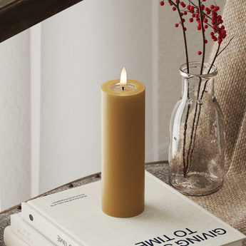 Dette elegante LED bloklys i Karry tilbyder en virkelighedstro 'Real Flame'-effekt, der er så naturtro som et ægte stearinlys. Med en højde på 15 cm og en diameter på 5 cm er hvert LED bloklys omhyggeligt fremstillet i stearin & resin, udstyret med en livagtig 3D-flamme og en unik belægning af resin i toppen. Denne særlige kombination skaber ikke kun en autentisk følelse, men giver også det karakteristiske 'wet look', der efterligner smeltet stearin perfekt.