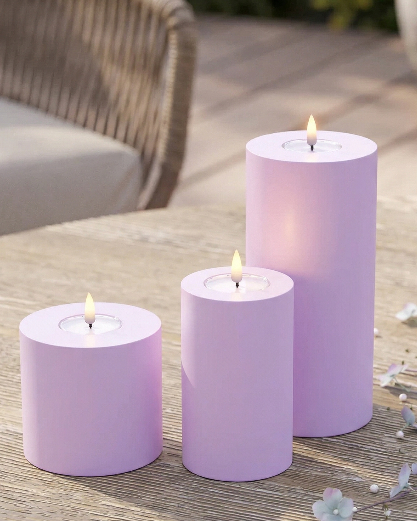 Isso ao ar livre Vela pilar com LED é produzido em uma bela Lavanda sombra, que confere uma expressão suave e calma a terraços, varandas e decorações exteriores. A cor cria uma atmosfera leve e harmoniosa e se adapta perfeitamente a ambientes modernos e clássicos.
